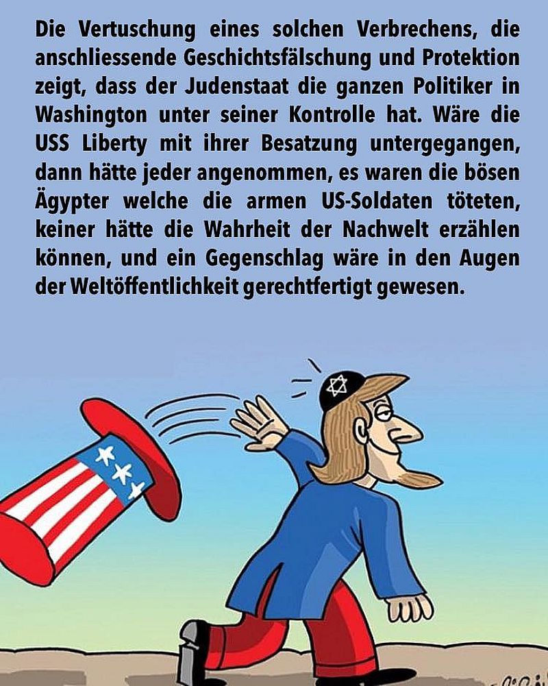 Die Vertuschung eines solchen Verbrechens, die anschliessende Geschichtsfälschung und Protektion zeigt, dass der Judenstaat die ganzen Politiker in Washington unter seiner Kontrolle hat. Wäre die USS Liberty mit ihrer Besatzung untergegangen, dann hätte jeder angenommen, es waren die bösen Ägypter welche die armen US-Soldaten töteten, keiner hätte die Wahrheit der Nachwelt erzählen können, und ein Gegenschlag wäre in den Augen der Weltöffentlichkeit gerechtfertigt gewesen.