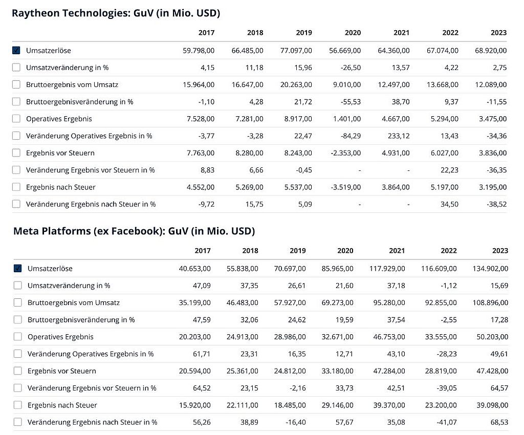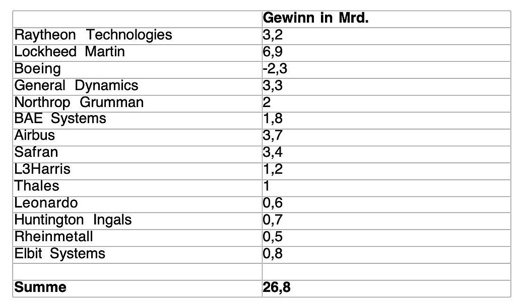 Selbst wenn man all die Firmen zusammennimmt, macht Meta/Facebook mit fast 40 Milliarden mehr Gewinn als all die Firmen zusammen. Die meisten Rüstungskonzerne haben eine Umsatzrendite von weit unter 10%. Es gibt zig Branchen in denen die Umsatzrenditen wesentlich höher sind. Zu erwähnen ist auch noch, dass einige Firmen wie Airbus den grössten Teil ihres Geldes im zivilen Bereich erwirtschaften.