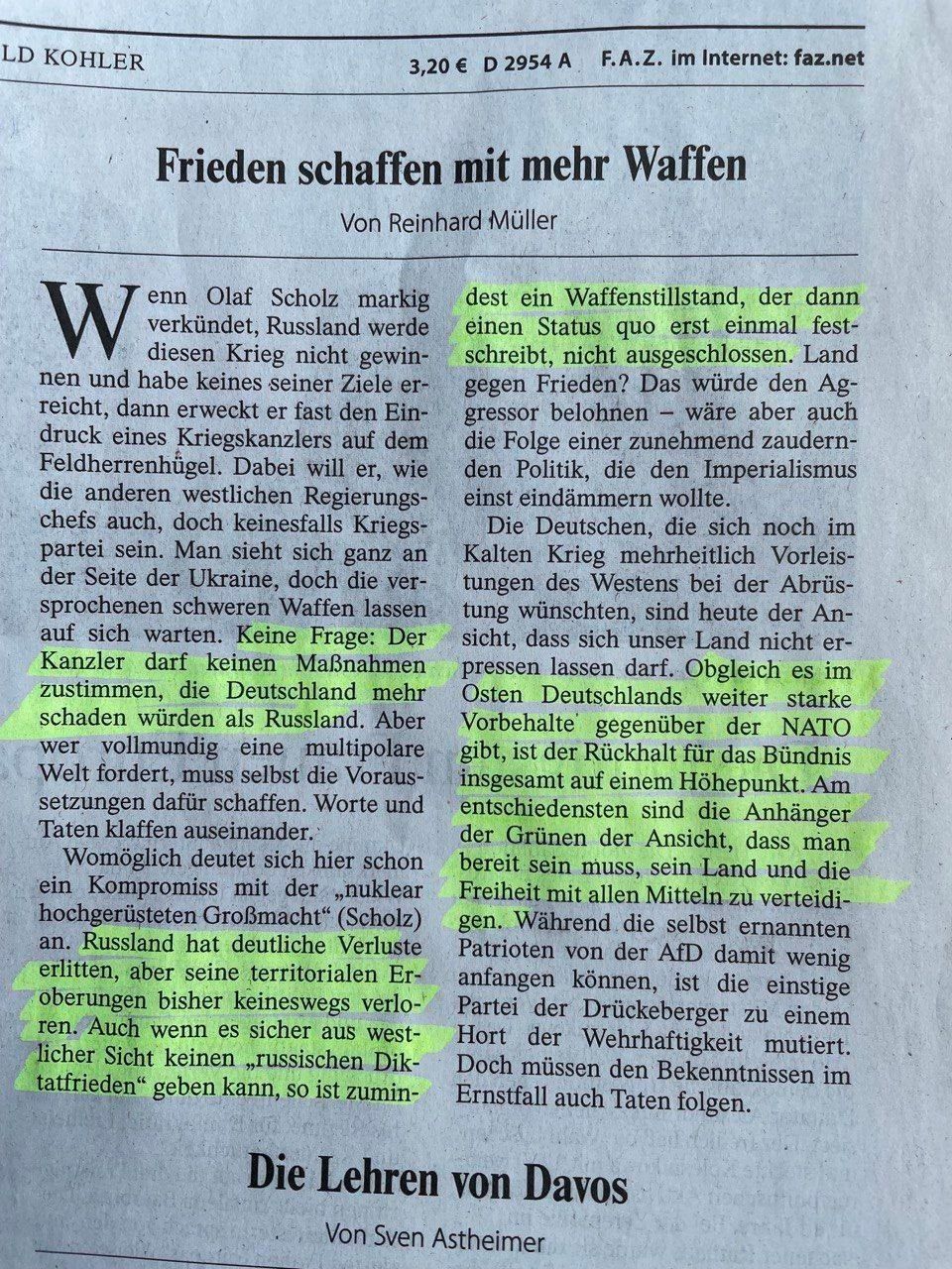 Jetzt plötzlich geht selbst dem Propaganda-Westen das Lichtlein auf, dass die russische Arme im Donbass einen Geländegewinn nach dem anderen verbucht, ganze ukrainische Einheiten sich weigern weiterzukämpfen, weil ihnen der Nachschub ausgeht und sich eingekesselte ukrainische Truppen eilig zurückziehen. Mission Complete und nun wird langsam klar, sogar der FAZ, was jedem immer hätte klar sein müssen: Es gab nie einen Zweifel daran, dass Russland seine selbstgestellte Aufgabe erledigen wird. Dass die Ukraine «diesen Krieg gewinnt», wie westliche Politiker posaunten, war noch nie möglich. Eine Lösung kann und wird es nur am Verhandlungstisch geben. Bisher weigert sich Schneelensky auf Betreiben Washingtons, sich um eine solche diplomatische Lösung zu bemühen, weil die USA den Konflikt möglichst lange hinauszögern wollen und grimmig entschlossen sind, bis zum letzten Ukrainer durchzuhalten – doch am Ende bleibt ihm gar nichts anderes übrig…