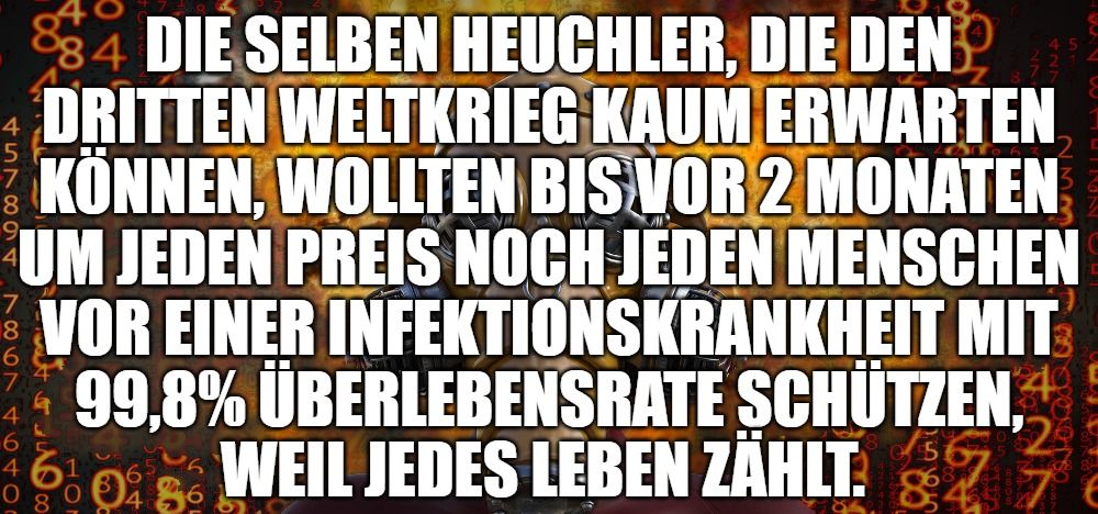 Die selben Heuchler, die den dritten Weltkrieg kaum erwarten können, wollten bis vor 2 Monaten um jeden Preis noch jeden Menschen vor einer Infektionskrankheit mit 99,8% Überlebensrate schützen, weil jedes Leben zählt.