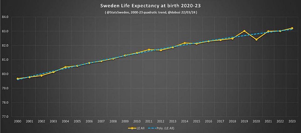 Die Lebenserwartung in Schweden ist auf Rekordhoch, keinerlei Trendbruch durch Pandemie erkennbar. Das Lockdown- und maskenfreie Schweden schneidet also für die Pandemie-Ära mit Abstand am besten ab, auch im Vergleich zu seinen Nachbarstaaten.