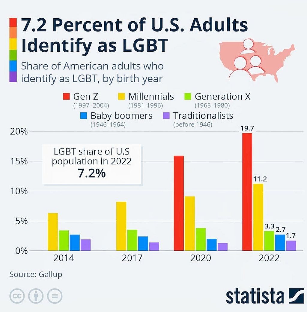 Unglaublich! 19.7% der Generation Z 1997- 2004 in den USA bezeichnet sich als LGBT+×÷=! Wann stehen die Eltern auf, denn die Propaganda wird in den Schulen gefördert, so berichtete eine Bekannte über die Zustände in Zürichs Schulen: «…Tochter war völlig überfordert…»