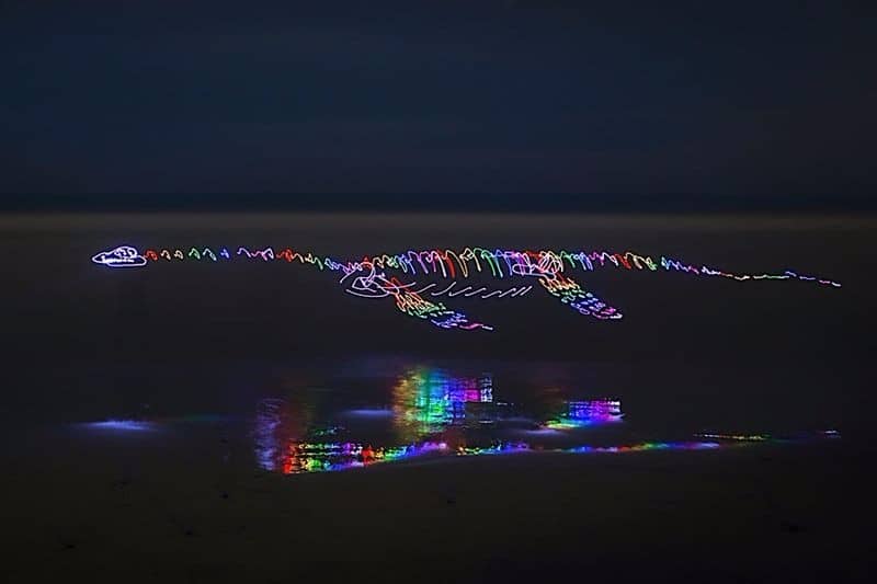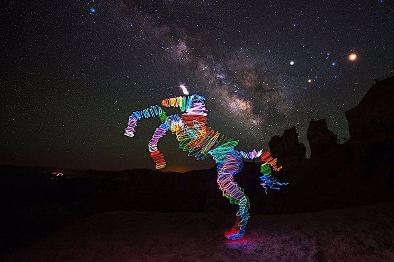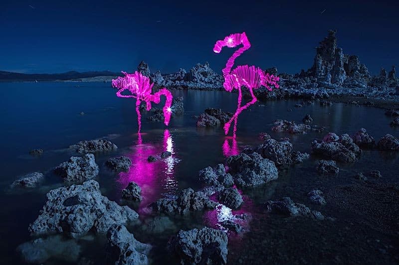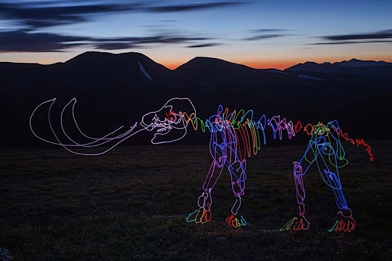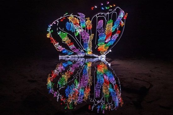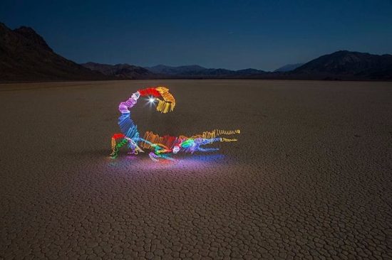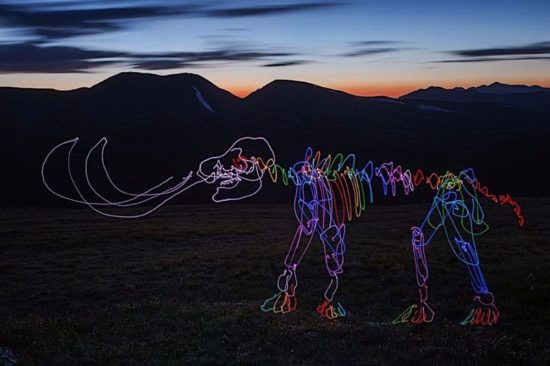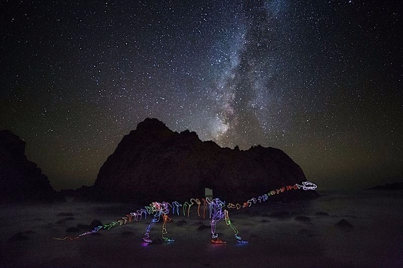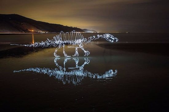 Wenn Darren Pearson Fotos macht, dann hat er kein bestimmtes Motiv vor der Kamera, denn das ergibt sich immer erst bei seiner Arbeit. Pearson hat sich darauf spezialisiert, mit einem selbst entwickelten Leuchtgerät Formen an den nächtlichen Himmel zu «malen» und die Kamera die Lichtbewegung aufzeichnen zu lassen. So entstehen mysteriöse Dinosaurier, Flamingos und Schmetterlinge am Nachthimmel. Pearson hat den Apparat, den er für seine Bilder benutzt, Night-Writer genannt und verkauft ihn für rund 56 Euro in seinem Online-Shop und für knapp fünf Euro extra bekommt man noch Aufsätze für verschiedene Farben obendrauf. Im Shop gibt es auch Fotos in Museumsqualität zu erwerben. Der Künstler lebt und arbeitet in Los Angeles und will mit seiner Arbeit die Licht-Malerei populär machen…