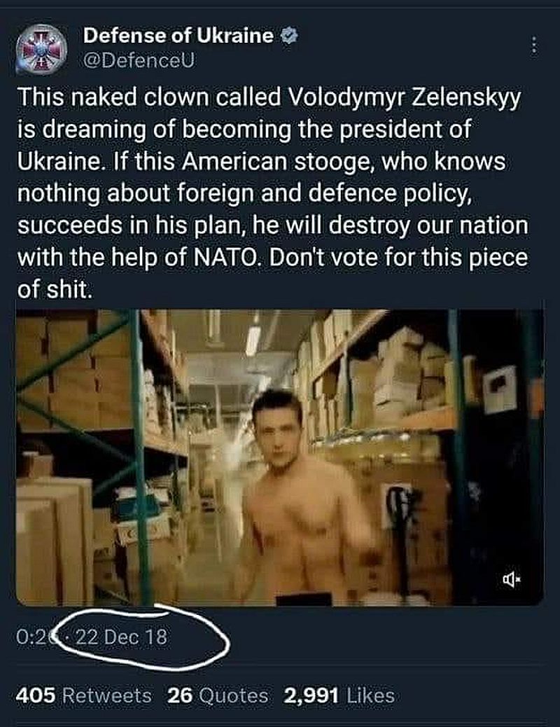 Dieser nackte Clown namens Wolodymyr Selenskyj träumt davon, Präsident der Ukraine zu werden. Wenn dieser amerikanische Handlanger, der keine Ahnung von Aussen- und Verteidigungspolitik hat, mit seinem Plan Erfolg hat, wird er unsere Nation mit Hilfe der NATO zerstören. Stimmen Sie nicht für dieses Stück Scheisse.