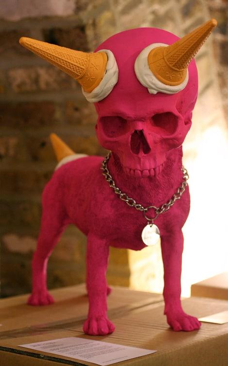 Mikael Alacoque designt Hunde mit Schädeln und Cornet- oder in hauchdeutsch Soft-Ice-Hörnern. WTF?! Aber sieht absolut genial aus. Das Teil würde irgendwie in die Handtasche von Paris Hilton passen…