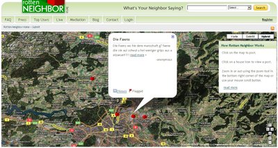 Nicht das die allgemeinen Überwachungsgelüste der Staatsschützer und im Namen des Anti-Terrors genug wären, jetzt kann jedermann auf Rottenneighbor.com seinen Nachbarn an den Webpranger stellen. Da freut sich doch der kleine Denunziant!