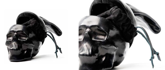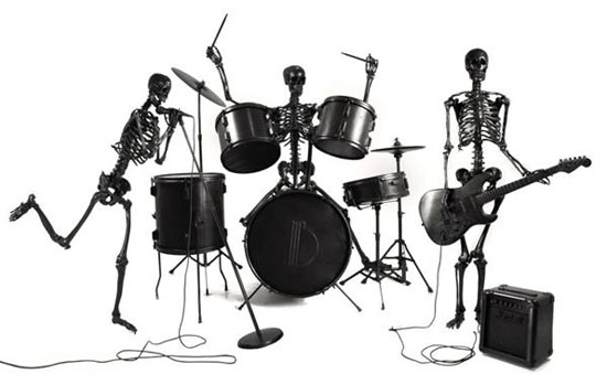 Natalia Brilli wickelt neben Skateboards, Uhren, Laptops und anderer Objekte auch diese Skelett-Rockband in Leder ein…