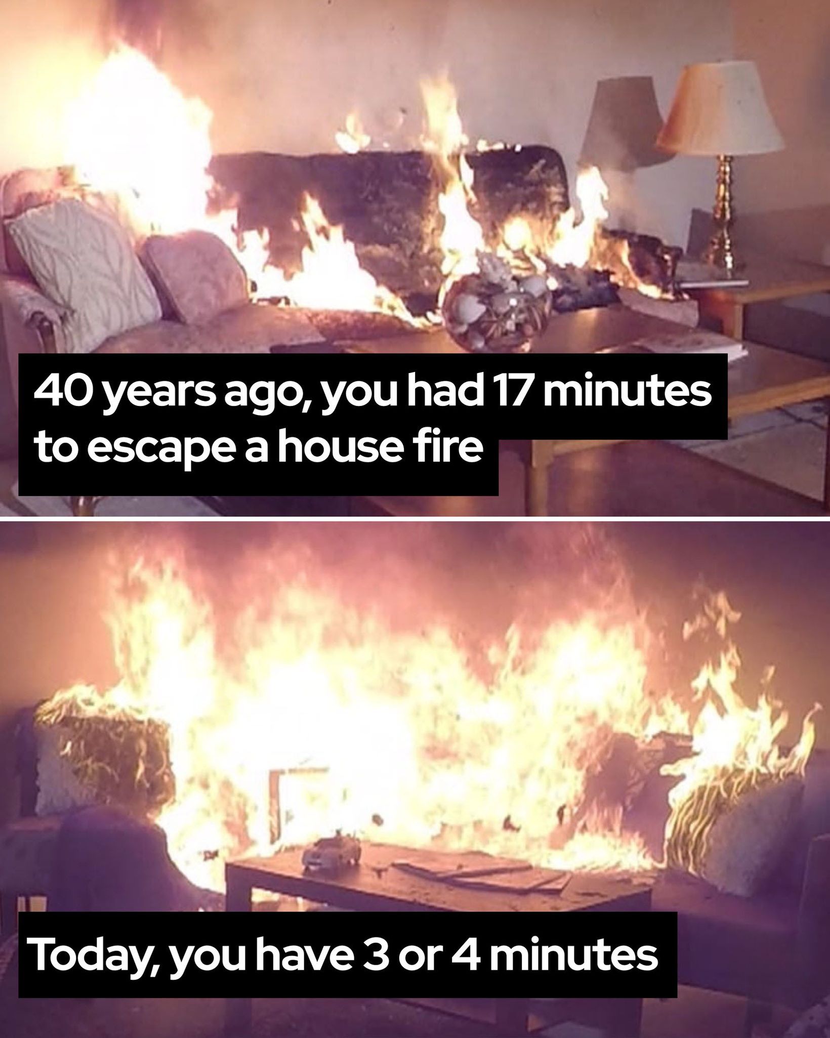 Früher wurden Häuser aus Massivholz gebaut und mit natürlichen Materialien wie Baumwolle, Wolle und echtem Leder ausgestattet. Brände in diesen Häusern breiteten sich langsam aus, sodass die Menschen Zeit hatten, aufzuwachen, zu reagieren und zu fliehen.