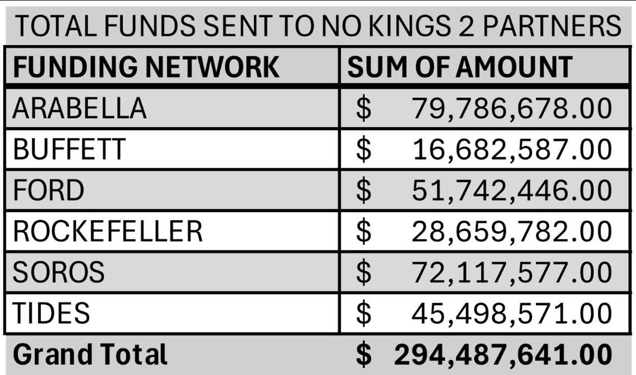 $294’487’641 wurden den offiziellen No Kings 2.0 Partnern & Organisatoren nachverfolgt. Jeder Cent floss durch dasselbe «Riot Inc.» Dark-Money-Netzwerk, die üblichen Verdächtigen, die sich hinter «Basisaktivismus» und «soziale Gerechtigkeit»-Slogans verstecken: