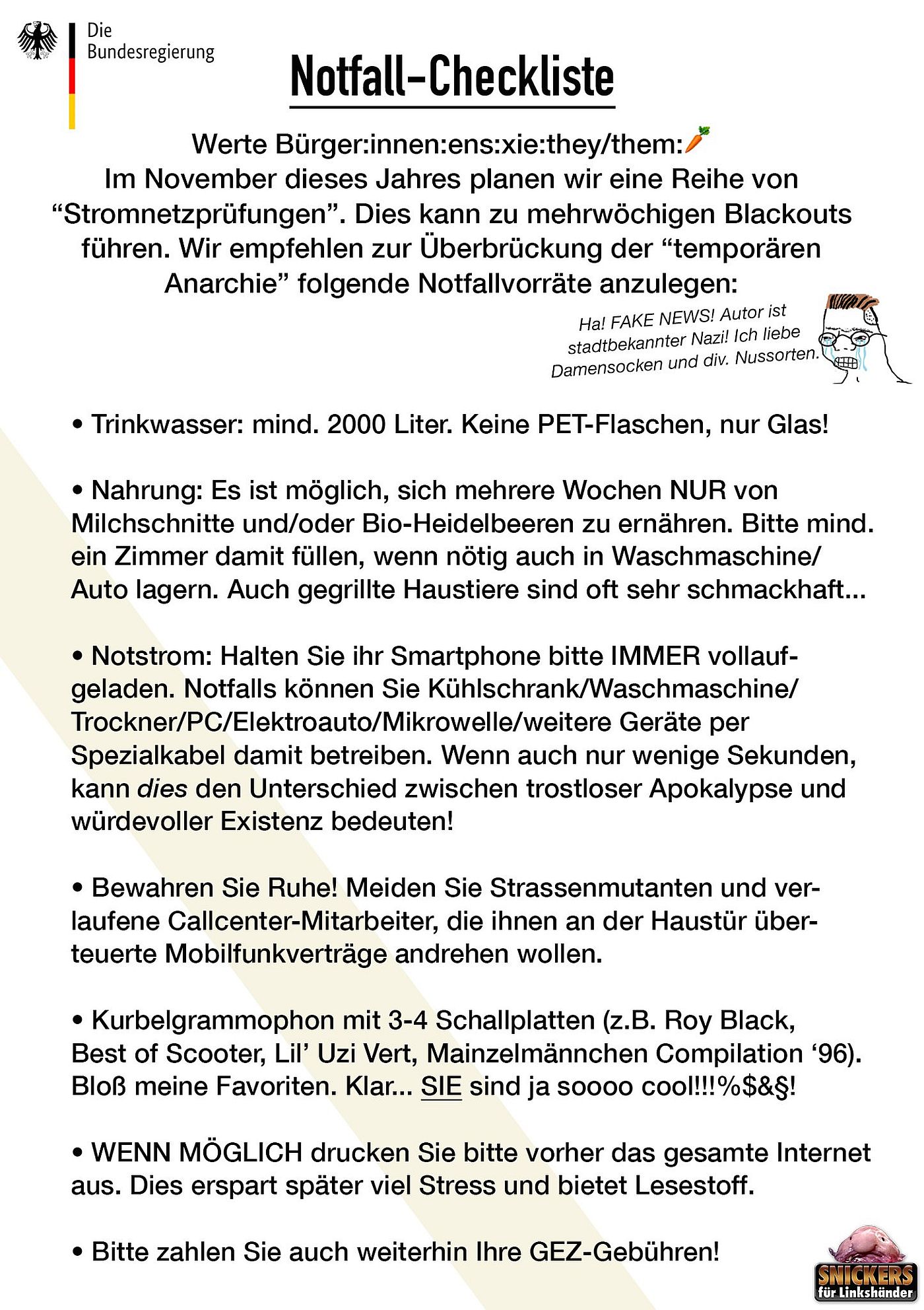 Die Bundesregierung informiert: Werte Bürger:innen:ens:xie:they/them: Im November dieses Jahres planen wir eine Reihe von «Stromnetzprüfungen». Dies kann zu mehrwöchigen Blackouts führen. Wir empfehlen zur Überbrückung der «temporären Anarchie» folgende Notfallvorräte anzulegen:
