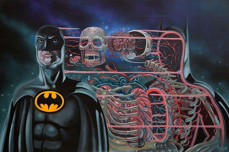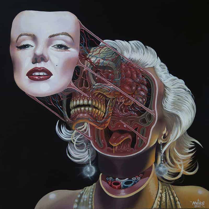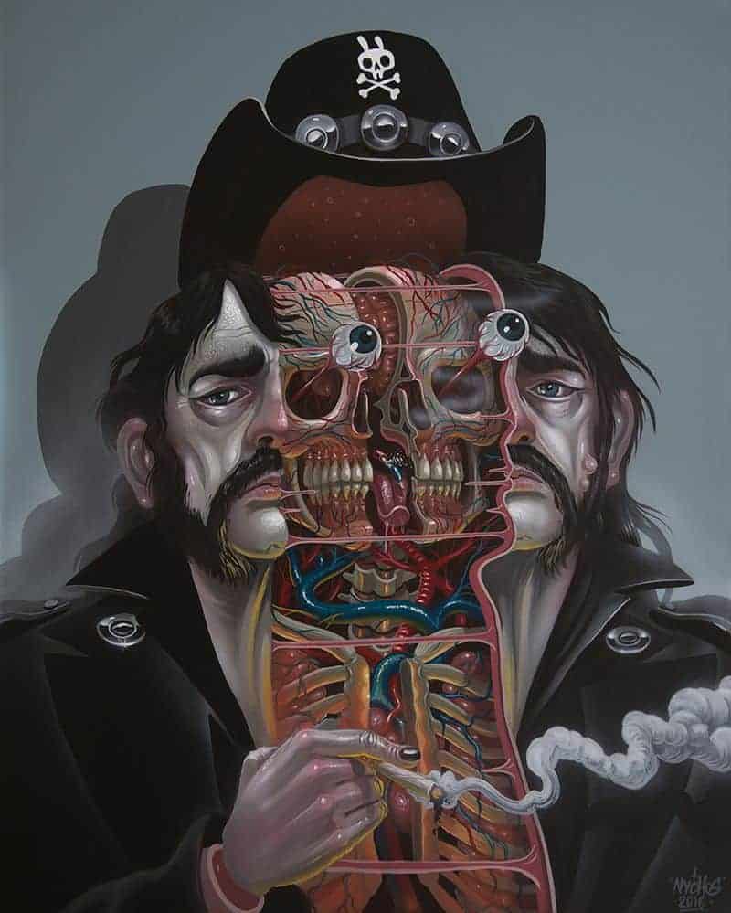 Der Österreicher Nychos zerlegt in seinen Portraits in der Serie «IKON» allerhand Persönlichkeiten. Mit dabei sind zum Beispiel Michael Knight, Batman, Yoda oder unser Lemmy. Nychos lässt uns also hinter die Maske blicken und da wird schnell klar, dass wir alle nur aus Fleisch und Knochen bestehen.