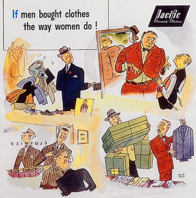 1946: Frauen gelten als unentschlossen und zwängen sich gerne in Kleider, welche Ihnen eigentlich zu klein sind. Und sobald das gleiche Kleid eine andere Frau trägt, bringen Sie es zurück ins Geschäft. Männer brauchen nur einen Blick auf das Pacific Label zu werfen um zu wissen, dass die Kleidung Ihm entspricht, Sir.