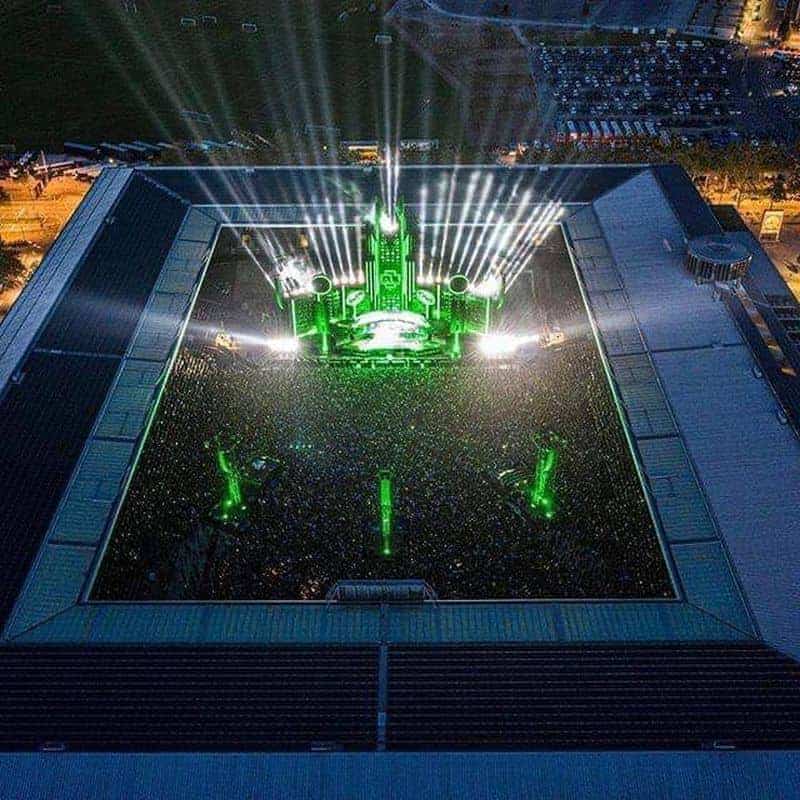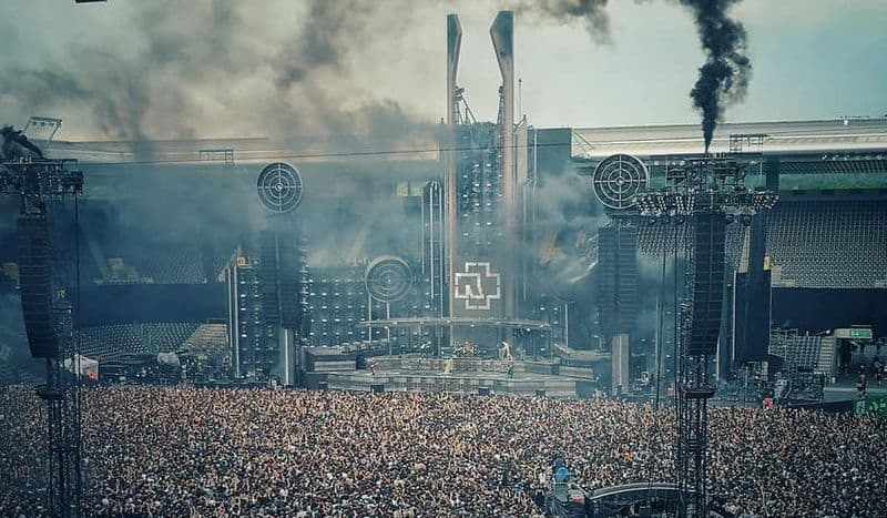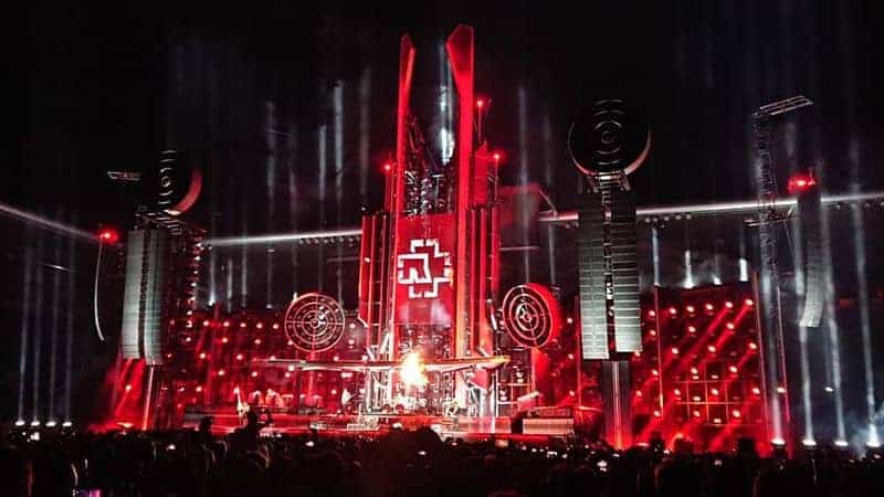 «Deutschland», das in der Videoversion 2000 Jahre deutscher (Kriegs-)Geschichte aufwendig abbildet, wird hier auf der abgedunkelten Bühne eher schlicht inszeniert. Die Bandmitglieder tragen beleuchtete Kostüme, die sie wie Strichmännchen erscheinen lassen. Beim Song «Puppe», wo es heisst: «Dann reiss‘ ich der Puppe den Kopf ab», schiesst Lindemann mit einem Flammenwerfer auf einen riesigen Kinderwagen und setzt ihn in Flammen. Bei «Mein Teil» sitzt Christian Lorenz in einem Suppentopf und wird dort buchstäblich gekocht. Das Lied «Diamant» wird ganz ohne Licht, Knaller, Feuer oder andere Effekte gesungen. Bei «Ohne dich» leuchten Zehntausende Feuerzeuge in der Arena, sie wurden jedem Besucher beim Einlass mitgegeben. Irgendwann verbeugen sich die Bandmitglieder vor dem Publikum. Das kann aber doch nicht das Ende sein?! Ist es auch nicht. Nach ein paar Minuten tauchen die sechs Bandmitglieder zusammen mit dem Duo Jatekok auf einer gehobenen Plattform mitten im Stadion auf und spielen zusammen «Engel», der erste kommerzielle Hit der Band aus dem Jahr 1997. Dann steigen die Musiker einzeln in Schlauchboote, eins für jeden und werden vom Publikum auf Händen zurück zur Bühne befördert. Die Zugaben machen einen erheblichen Teil der Show aus, bevor Lindemann mit einer Kanone Seifenblasen auf das Publikum schiesst und die Bandmitglieder in einem Aufzug nach oben fahren. Dann ein weiterer Knall. Nach zweieinhalb Stunden ist die Show dann eindeutig vorbei.
