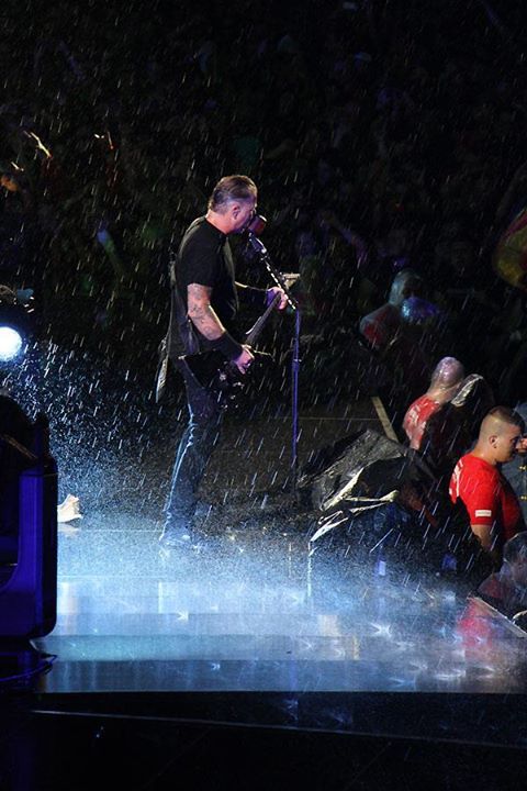Als Metallica den einzigen neuen Song des Abends spielten, ging es los: Im Schutze der Dunkelheit hatte sich eine Gewitterfront übers Joggeli geschoben, welche nun die Schleusen öffnete. Die Erstaufführung des Songs, der möglicherweise auf dem neuen Album erscheinen wird, fiel somit komplett ins Wasser. Dabei ist «Lords Of Summer» nicht mal sooo übel. Mit Galopp-Rhythmus und den Wechseln ins schwere Halftime befinden sich Metallica zwar nahe dem Eigen-Plagiat. Egal, Zeit, um Biernachschub zu holen, für dessen Gewährleistung im Laufe der Woche einige Anstrengungen unternommen wurden. Drei Sattelschlepper mit insgesamt 400 Paletten Flüssigkeit standen im Stadion bereit. Fünf Kühlwagen und weitere fünf Kühlzellen kühlten die Getränke auf fünf Grad, zu den bestehenden Ständen im Stadion wurden zusätzliche 50 Durchlaufkühler – wie die mobilen Stände im Fachjargon heissen – installiert. Zudem entbehrte es nicht einer gewissen Ironie, dass sich ausgerechnet nach diesem Schlachtruf für den Sommer ein Regenschauer vom Himmel ergoss. Immerhin wusste Hetfield den plötzlichen Wetterumschwung zu nutzen und stellt sich für die Gesamtdauer von «Sad but True» auf die Rampe in den strömenden Regen. Das ist Solidarität zu den Fans, welche die eingängigen Strophen des wuchtigen Shuffles aus voller Kehle mitsangen. Und es stand nicht nur Hetfield, sondern auch Gitarrist Kirk Hammet und Bassist Robert Trujillo regelmässig auf dem Steg und liessen die Fans nicht alleine im Regen stehen, sondern standen mit ihnen im Regen und gaben dermassen Gas, dass selbst die Blitze, die über dem St. Jakob Park zuckten, zum Teil der Inszenierung wurden.
