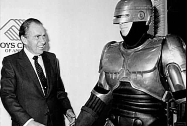 Freunde, auf dem folgenden Bild, übrigens ein kleines Juwel, seht ihr Robocop mit Richard Nixon! Erinnert etwas an den grandiosen Robonixon aus Futurama. Der historischen Hintergrund dieses Bildes, das im Jahre 1987 durch den verstorbenen legendären Rock’n’Roll Fotografen Chuck Pulin entstanden ist, zeigt das Meetup RoboCop mit dem pensionierte 37. Präsident der Vereinigten Staaten und fand während einer Charity-Veranstaltung zu der Veröffentlichung des Films auf VHS zu statt.