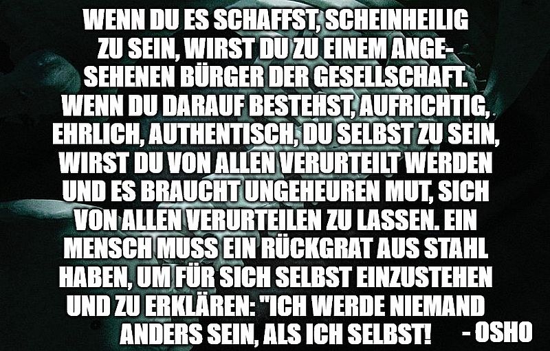 Wenn du es schaffst, scheinheilig zu sein, wirst Du zu einem angesehenen Bürger der Gesellschaft. Wenn Du darauf bestehst, aufrichtig, ehrlich, authentisch, Du selbst zu sein, wirst Du von allen verurteilt werden und es braucht ungeheuren Mut, sich von allen verurteilen zu lassen. Ein Mensch muss ein Rückgrat aus Stahl haben, um für sich selbst einzustehen und zu erklären: «Ich werde niemand anders sein, als ich selbst!»