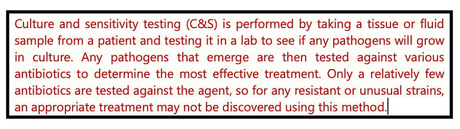 Dr. Hlavinka, ein Urologe mit einem internationalen Kundenstamm, schien in der Lage zu sein, Menschen wie Taylor zu helfen, deren Beschwerden andere Ärzte nur verwirrten und frustrierten. Taylor vereinbarte einen Termin. Hlavinkas erste Empfehlung hatte mit der Diagnose zu tun. Die Kultur- und Empfindlichkeitstests (C&S), die seine anderen Ärzte durchgeführt hatten, waren lange Zeit der Standard gewesen, hatten aber bei Roberts Erkrankung eine Fehlerquote von 40 bis 70 %. Die Genauigkeit war sogar noch etwas schlechter, da das Verfahren nun automatisiert war – die einzige Änderung in dieser Technologie seit der Zeit des Bürgerkriegs.