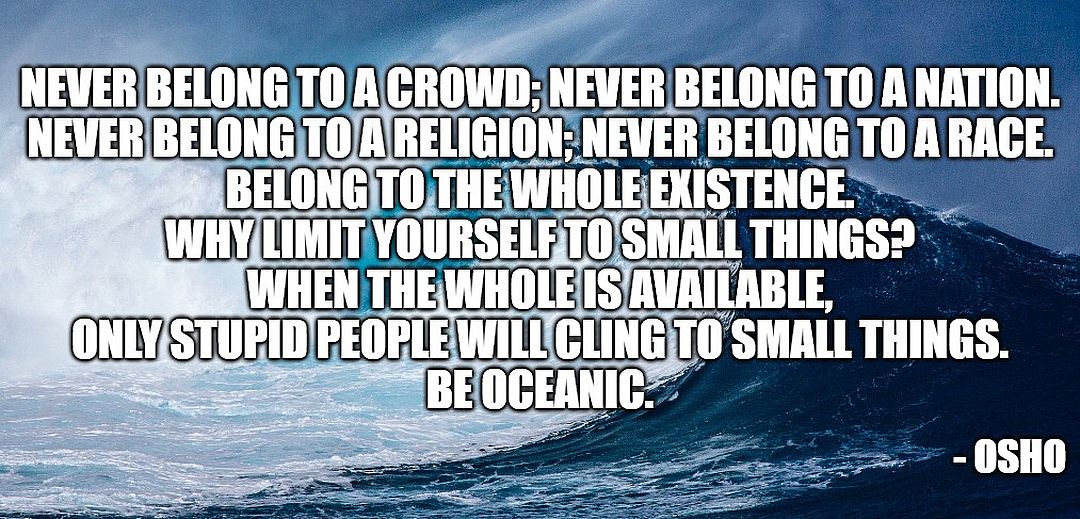 Gehöre niemals zur Masse; gehöre niemals zu einer Nation; gehöre niemals zu einer Religion; gehöre niemals zu einer Rasse. Gehöre zur ganzen Existenz. Warum sich auf kleine Dinge beschränken wenn das Ganze zur Verfügung steht? Nur dumme Menschen werden sich an kleine Dinge klammern.