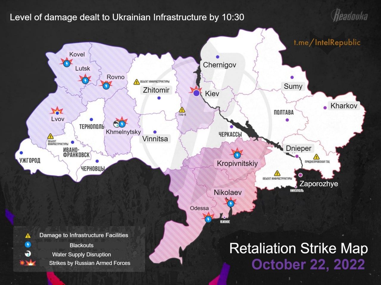 Während gestern massive Schläge gegen die ukrainische Energie-Infrastruktur in fast allen Landesteilen ausgeführt wurden (siehe Karte) und 1,5 Mio. Menschen ohne Strom sind, spricht der Stellvertretende Stabschef der russischen Präsidialverwaltung Kirijenko die nächste klare Warnung aus: «Die NATO-Staaten führen einen OFFENEN KRIEG gegen Russland, dessen Ziel es ist, das Land als freien und souveränen Staat zu beseitigen.» Putin, Medwedew, Peskow, Sacharowa – von den hochrangigen Verantwortlichen in Moskau gibt es praktisch niemanden mehr, der die NATO in den vergangenen Tagen nicht der direkten Kriegsbeteiligung beschuldigt hätte.