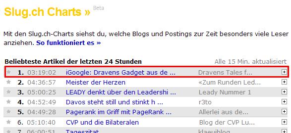 Oha, dass hätt‘ ich nun nicht erwartet, aber wie ich gerade gesehen habe ist mein Gadget für iGoogle, resp der Beitrag dazu, auf Platz Nr. 1 bei den SLUG Charts…