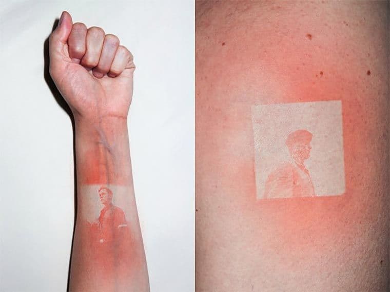 Selbstverständlich sind das hier keine Tattoos. Sind eher «Burnings» oder so. Jedenfalls brennt Thomas Mailaender mittels einer UV-Lampe Foto-Motive auf die Haut. Also Freunde, beim nächsten Strandurlaub einfach mal die Negative des vergangenen Urlaubs auf den Bauch legen! Die Bilder stammen aus dem Buch Illustrated People von Mailaender.