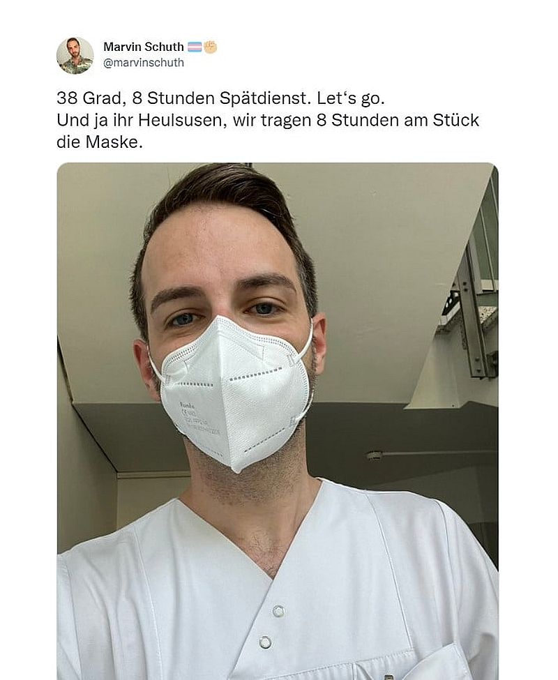 Jetzt, wo zehntausende ungeimpfte Pflegekräfte mit Hirn die Krankenhäuser verlassen mussten, bleiben halt nur noch solche Marvins übrig. Da fühlt man sich doch in kompetenten Händen! Übrigens, Gebrauchsdauer für FFP2-Maske laut Bundesanstalt für Arbeitsschutz beträgt maximal 75 Minuten…