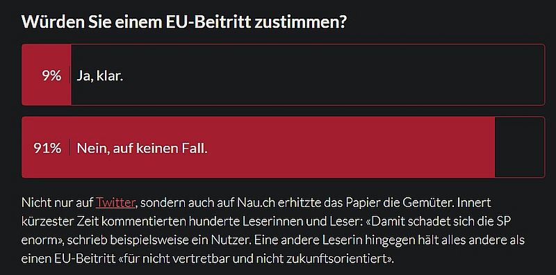 Übrigens, der verlinkte Artikel bei Nau.ch war erst völlig anderslautend online, die Tendenz im Original Artikel war erst deutlich positiver zum EU-Beitritt gehalten – doch durch die offensichtlich Contra-Haltung, welche sich u.a. über Social-Media verbreitete, sah man sich gezwungen, die ursprüngliche Pro-Haltung im Artikel zu korrigieren: