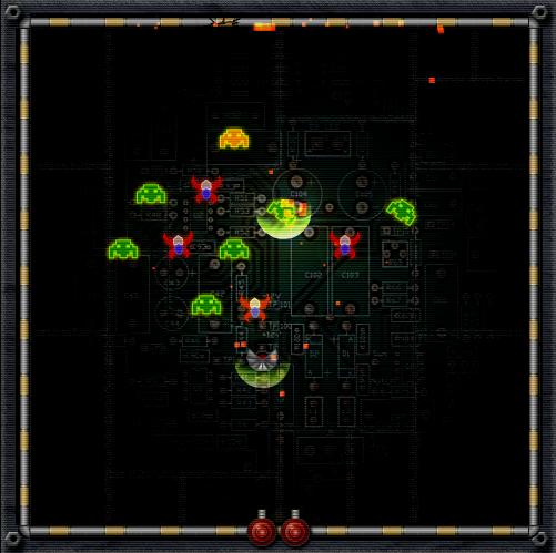 Man steuert ganz normal über die Pfeiltasten der Tastatur und feuert per Leertaste. Der Clou: Drückt man eine der vertikalen Pfeiltasten (hoch, runter), so kann man seine beiden Kanonen entweder miteinander verbunden oder unabhängig voneinander spiegelverkehrt (oder so) über den das Spielfeld umgebenen Zaun bewegen. Das verspricht zunächst einige Verwirrungen, eröffnet aber ganz neue taktische Möglichkeiten. Trifft man einen Gegner mit beiden Kanonen gleichzeitig, so wird dieser nicht nur stärker verletzt, sondern hinterlässt beim Ableben auch Powerups, welche die eigene Feuerkraft bzw. das eigene Schild verstärken.