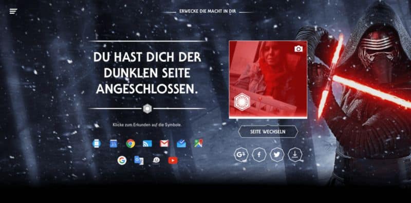 Ab sofort kann sich jeder angemeldete Nutzer bei Google für die «helle oder dunkle Seite der Macht» entscheiden. Star Wars Fans wissen was gemeint ist und alle anderen können sich die Marketingaktion ab sofort unter www.google.com/starwars/ anschauen. Als ob sich irgend jemand für die «helle» Seite entscheiden würde… Muahahahar!