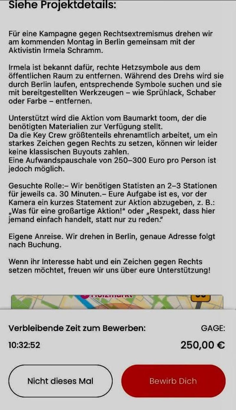als Rentner mit einer äusserst geringen Rente (trotz permanenter Berufstätigkeit) haben wir uns bei diversen Agenturen für einen Nebenjob als Komparsen für Filmproduktionen angemeldet. Gestern erhielt mein Mann über die Online-Agentur Extra Fresh das beiliegende Angebot, das uns sprachlos machte. Leider wissen wir nicht, wer dahinter steckt.
