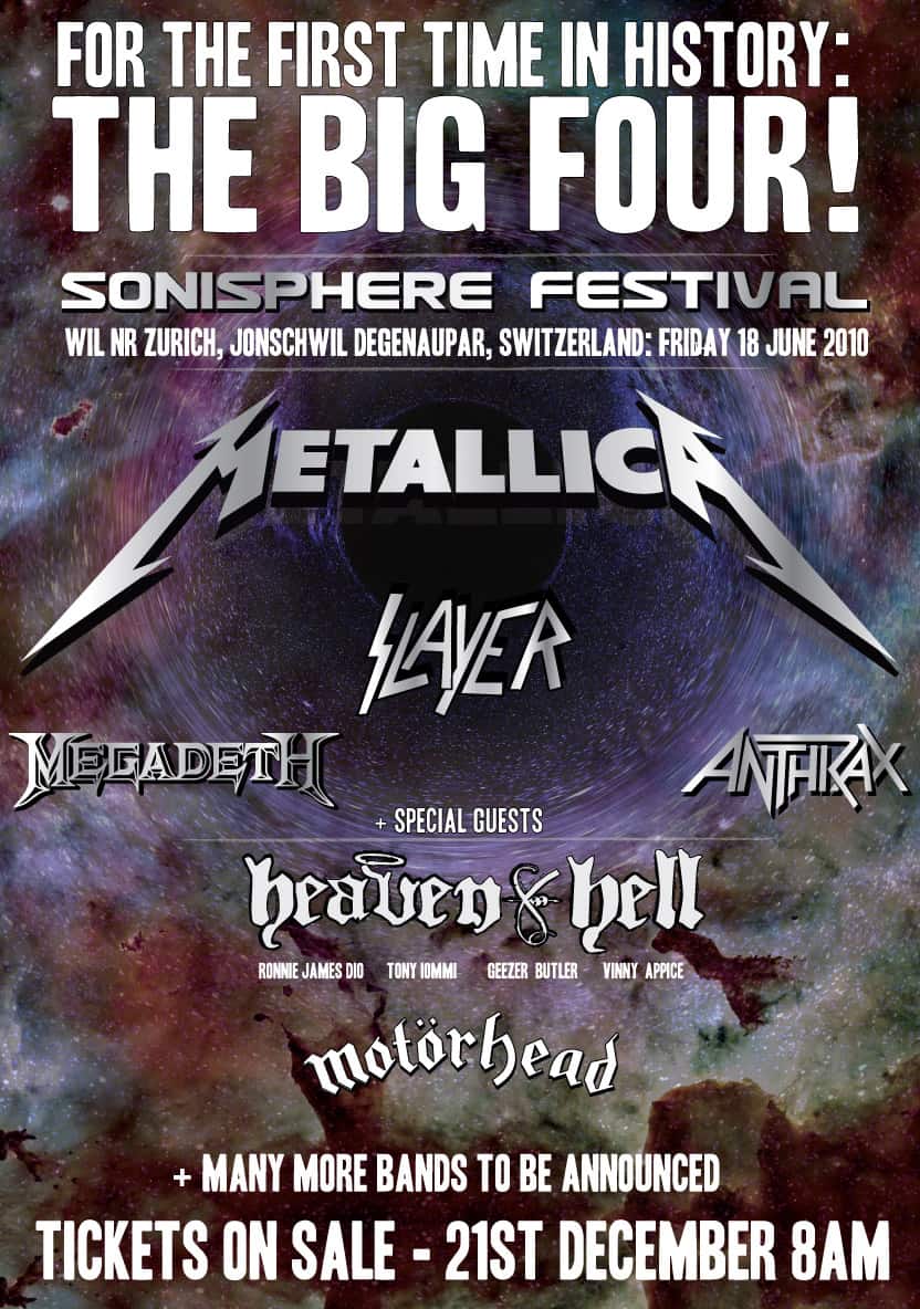The world wide web has been abound with speculation on a possible “BIG FOUR” tour for several months. Now, SONISPHERE can exclusively reveal that METALLICA, SLAYER, MEGADETH and ANTHRAX will play together for the first time in history, in a move that will have metalheads across the globe frenzied with excitement.