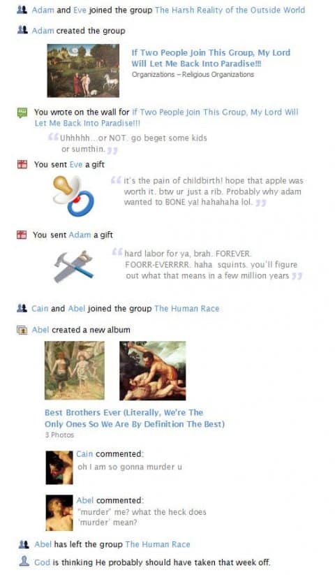 Da hat doch tatsächlich jemand die Story der Genesis in Facebook nachgestellt. Und ich finde ja, es sollten mehr Mythen bei Facebook dekonstruiert werden, aber wer hört schon auf mich?