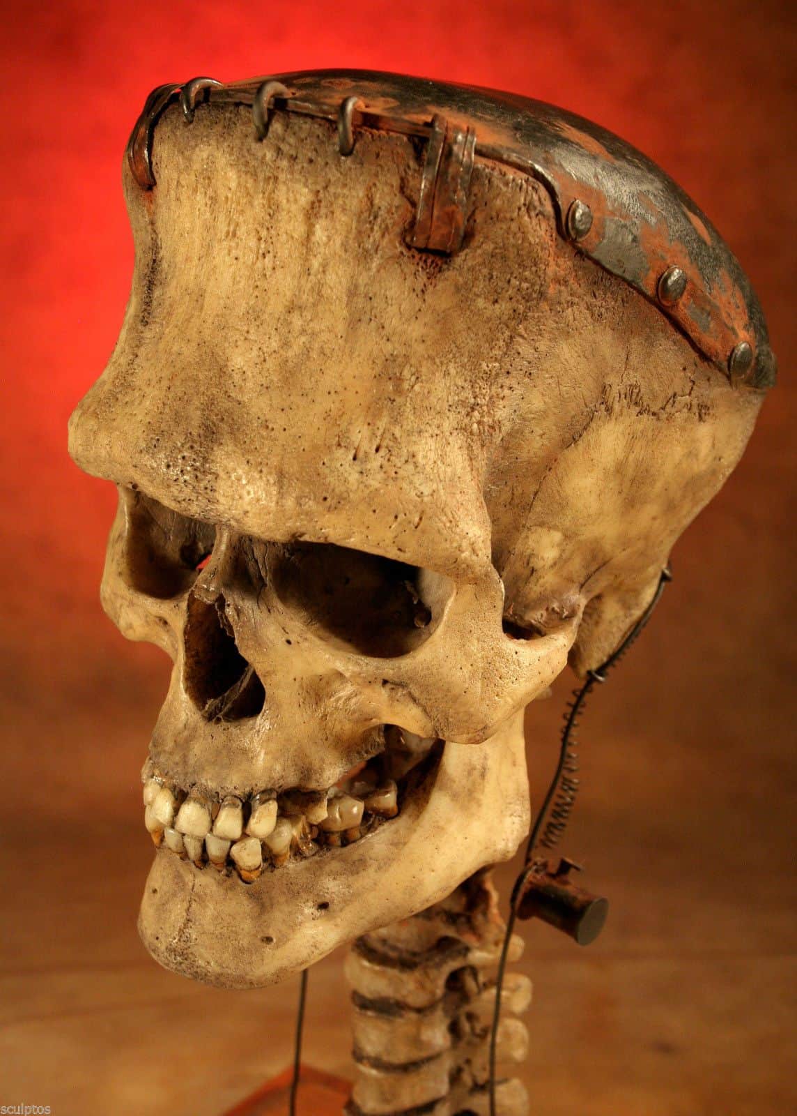 Künstler Thomas Kübler hat diesen grossartigen Frankenstein Schädel mit Wirbelsäule aus Festharz gegossen. Ein Muss für Frankenstein Horror-Fans oder Sammler von Kuriositäten, mehr Infos und Bilder dazu gibts bei Obsessed With Skulls…