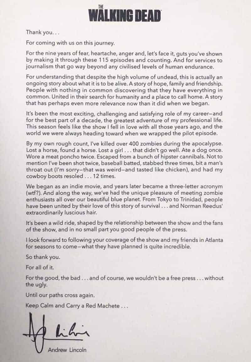 Neun Staffeln lang kämpfte sich Andrew Lincoln in der Rolle des Rick Grimes durch den Zombie-verseuchten Süden der USA, in den kommenden zwei Folgen dürfen wir nun Rick beim Sterben zusehen, denn Andrew Lincoln nimmt seinen Hut. Der Schauspieler hat zum Abschied einen emotionalen Brief verfasst. Nun endet Andrew Lincolns «The Walking Dead»-Ära und Norman Reedus, alias Daryl Dixon übernimmt das Ruder, – der muss nun wohl oder übel etwas mehr sprechen, als in den vergangenen Staffeln….