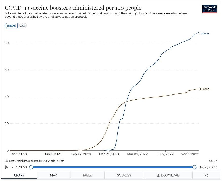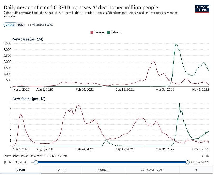 Taiwan hat mit einer Booster-Impfquote von über 88 % eine der höchsten der Welt (im Vergleich Europa etwa 46 %) und nun eine der höchsten Fälle/Todesraten pro Millionen Einwohner. Ist sicherlich alles nur Zufall… die Impfung wirkt!