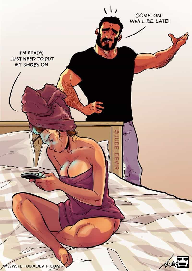 Der Illustrator und Grafikdesigner Yehuda Adi Devir aus Tel Aviv beweist mit seinen Illustrationen, dass der Pärchenalltag alles andere als langweilig ist. In liebevollen Zeichnungen illustriert er das chaotische und abenteuerliche Leben mit seiner Frau Maya. Die Szenen dieser Ehe überzeugen mit hohem Identifikationsfaktor. Denn wer kennt es nicht, wenn sie ihn als Heizung für ihre kalten Füße missbraucht oder jedes noch so kleine Ungeziefer mit einer monströsen Chemiekeule erschlägt? Neben diesen typischen Momenten einer Beziehung räumt der Künstler aber auch mit längst überholten Klischees auf und schafft damit womöglich neue. In welchem Bild könnt Ihr Euch am ehesten wiedererkennen?
