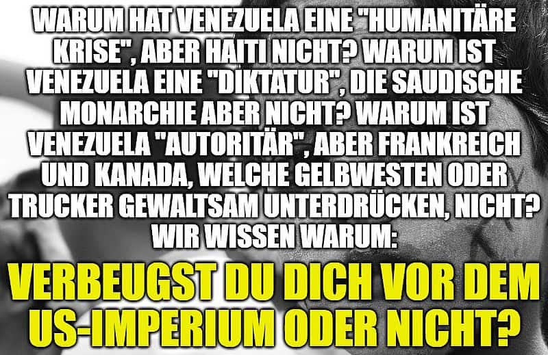 Warum hat Venezuela eine «humanitäre Krise», aber Haiti nicht? Warum ist Venezuela eine «Diktatur», die saudische Monarchie aber nicht? Warum ist Venezuela «autoritär», aber Frankreich und Kanada, welche Gelbwesten oder Trucker gewaltsam unterdrücken, nicht? Wir wissen warum: Verbeugst du dich vor dem US-Imperium oder nicht?