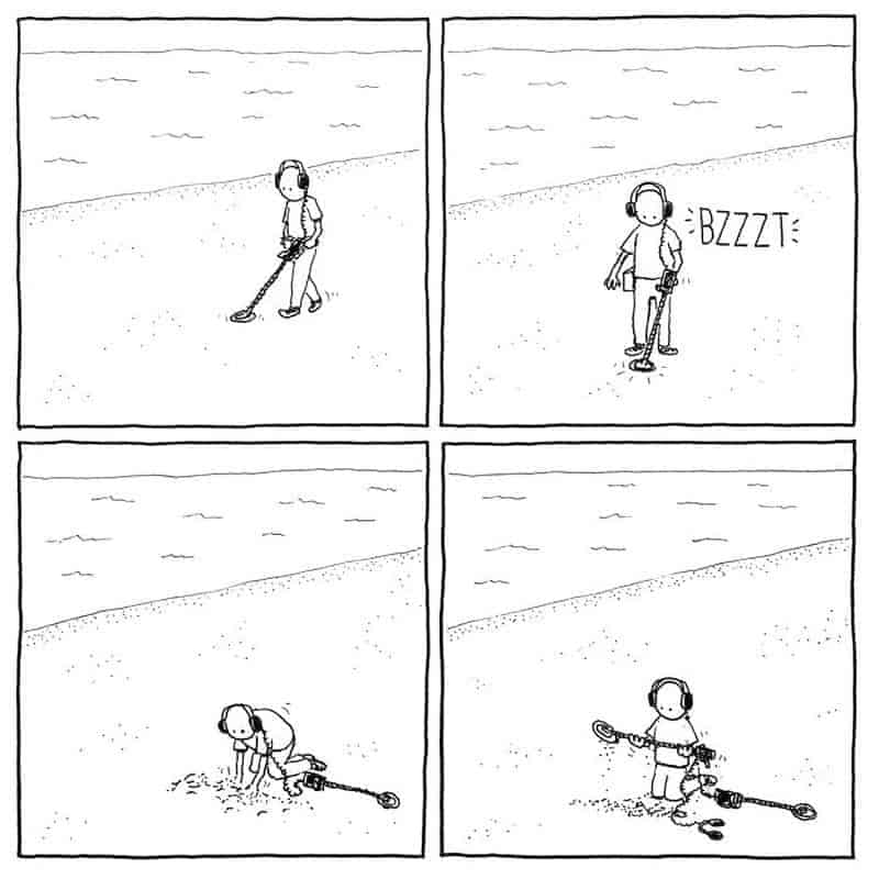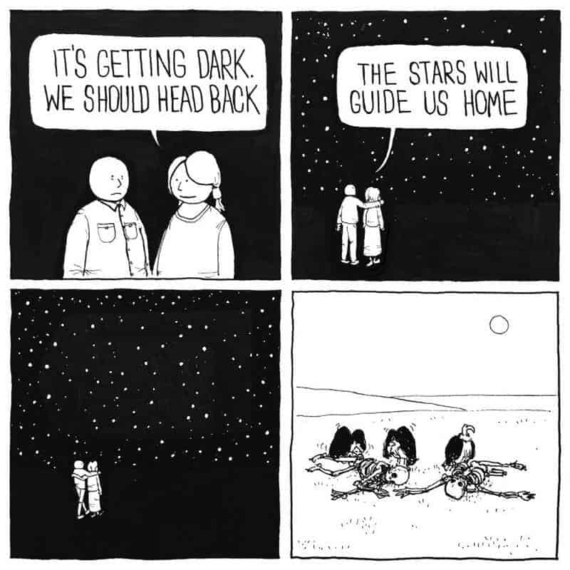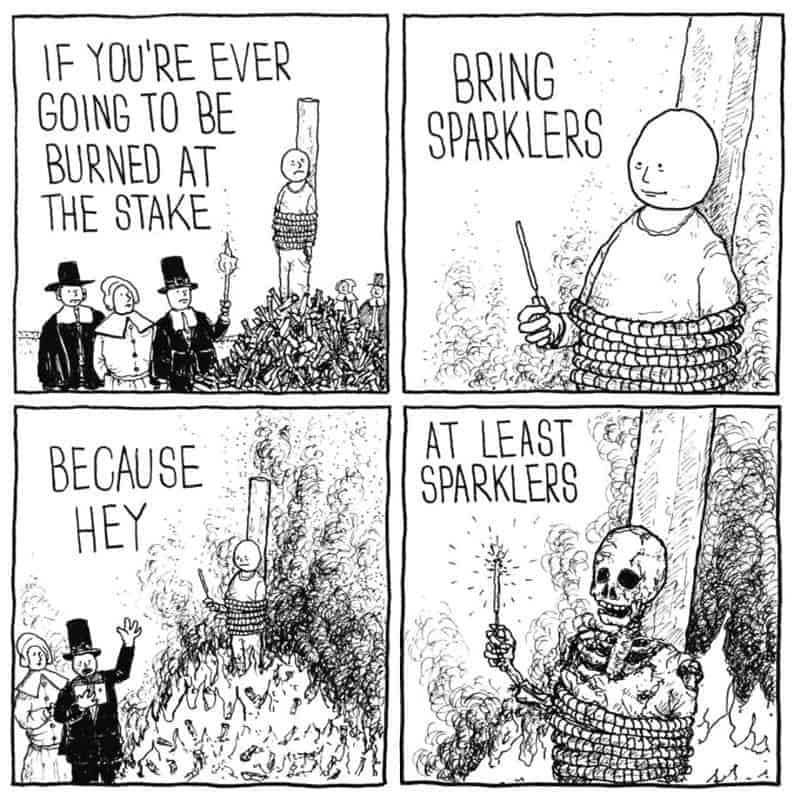 Wer einen absurden Sinn für Humor hat, sollte sich unbedingt die Comics von «Jake Likes Onions» ansehen. Der Künstler behandelt darin Themen wie Arbeit, Liebe, Tod und Existenzialismus und fügt bekannten Sprichwörtern und populären Filmen seine eigenen, schrulligen Wendungen hinzu. Der Künstler hat ein Geschick, um seine Geschichten mit einem irreführenden Gefühl der Unschuld zu beginnen, bevor er etwas bringt, was man nicht erwartet hätte. Einige sind hell, andere sind dunkel, aber alle sind komisch…