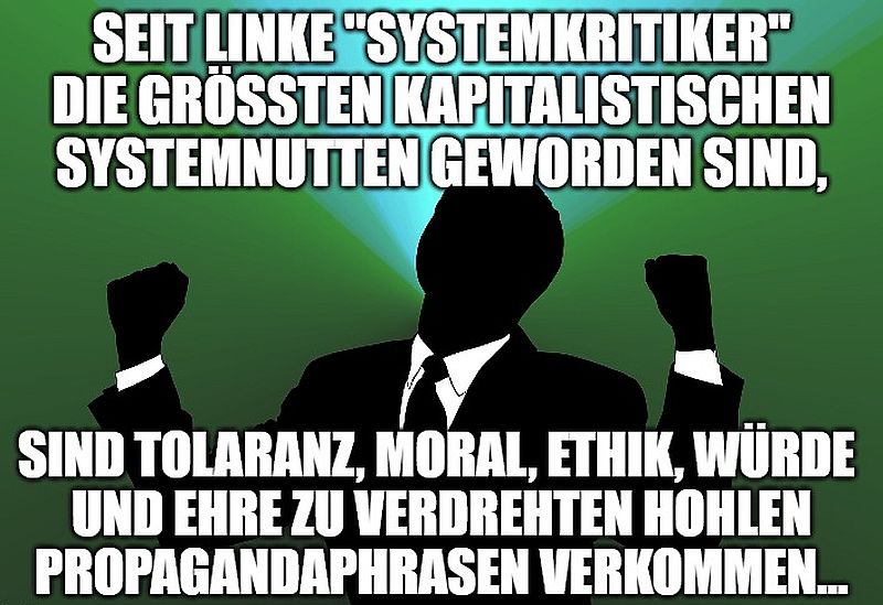 Seit linke «Systemkritiker» die grössten kapitalistischen Systemnutten geworden sind, sind Tolaranz, Moral, Ethik, Würde und Ehre zu verdrehten hohlen Propagandaphrasen verkommen…