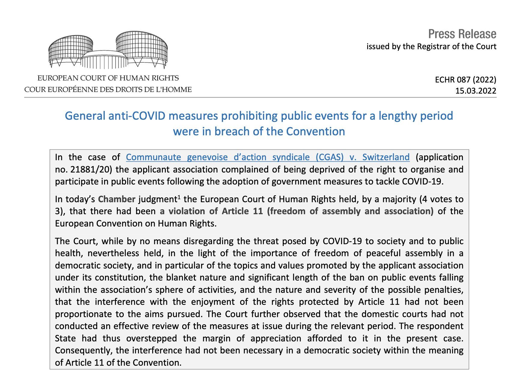 Eine juristische Einschätzung aus der Schweiz selbst weist darauf hin: «Bemerkenswert ist auch, dass der EGMR den Art. 11 EMRK im Bereich der Coronapandemie als notstandsfest ansieht. Die Schweizer Regierung hat sich erfolglos auf Art. 15 EMRK («Notstandsfall») berufen. […] Das ist für weitere heikle Coronamassnahmen, die in andere Menschenrechte eingreifen (Privatleben, Recht auf Freiheit, Recht auf körperliche Unversehrtheit), von grosser präjudizierlicher Bedeutung.