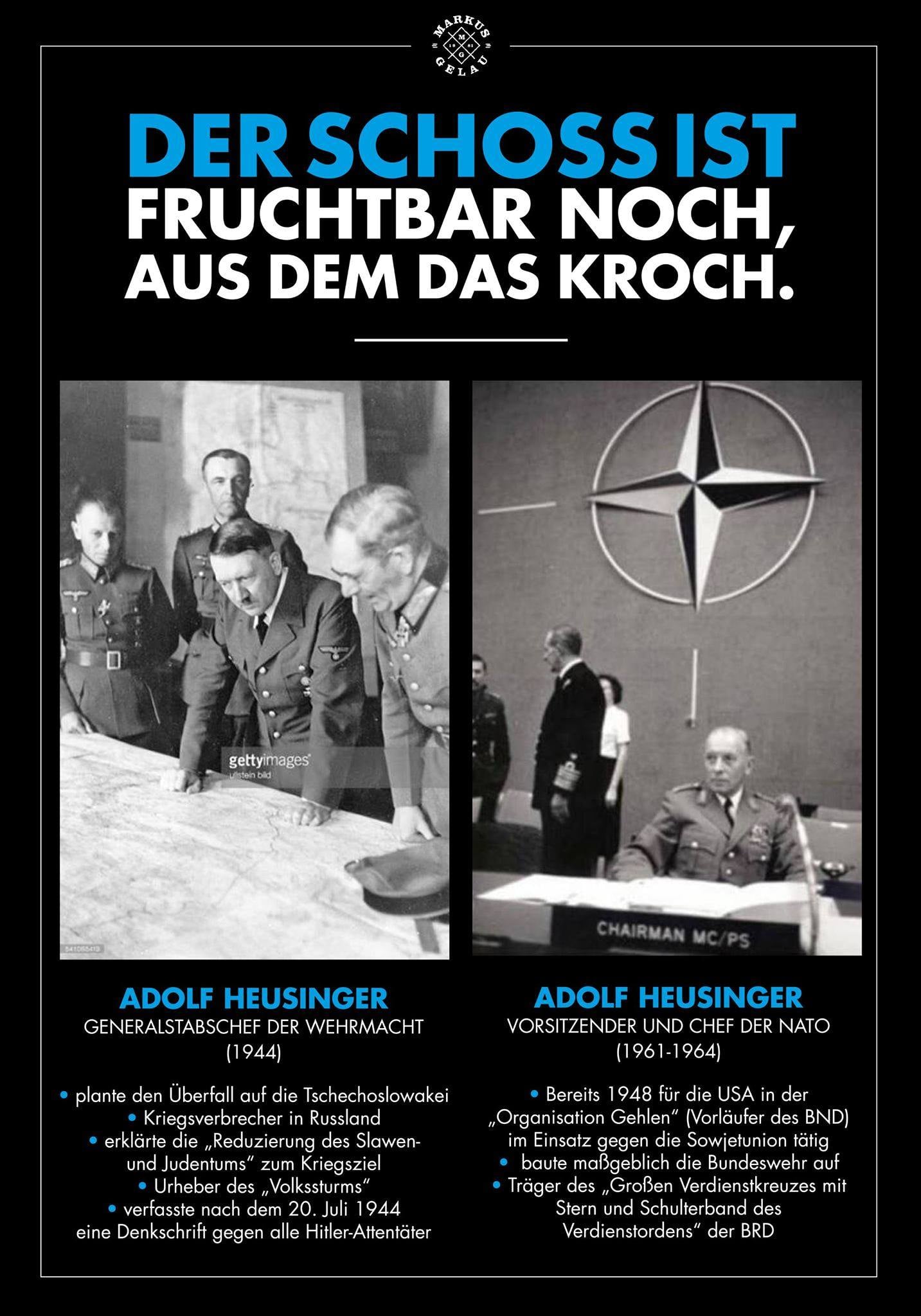 1959 (also 4 Jahre nach Gründung der Bundeswehr) waren von 14’900 Bundeswehroffizieren 12’360 ehemalige Offiziere der Wehrmacht, 300 Offiziere entstammten der Waffen-SS. Wehrmachts-Generalmajor Reinhard Gehlen versorgte bis 1945 als Chef der Abteilung *fremde Heere Ost* Nazi-Deutschland mit geheimdienstlichen Erkenntnissen über *DEN RUSSEN*. Gelernt ist halt gelernt: Schon kurz nach der deutschen Niederlage ging Gehlen wieder seinem Job nach. Nur der Auftraggeber hatte gewechselt. Unsere humanistischen US-Freunde wollten halt nicht auf deutsche Expertise bei der Bekämpfung des pöööhsen Purschen im Osten verzichten. Parallelen zur Gegenwart sind… rein zufällig.