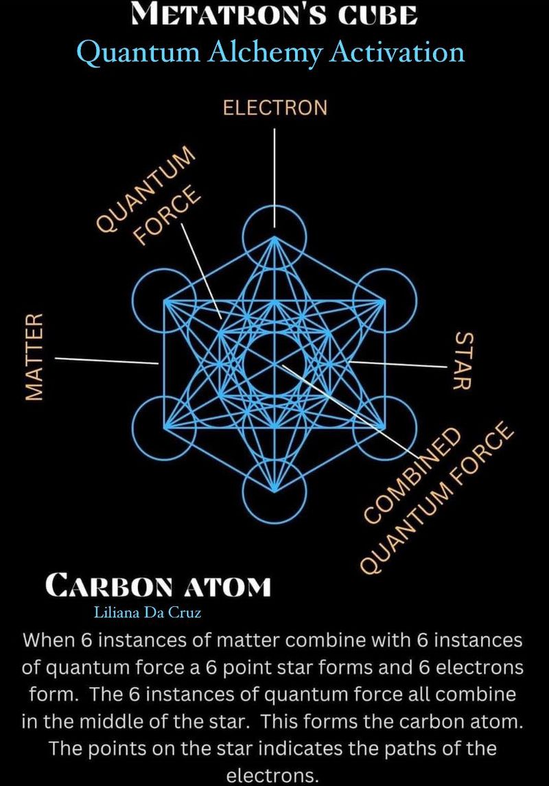 Um zu verstehen, warum Metatrons Würfel so wichtig ist, betrachten wir zunächst das Kohlenstoffatom, den Baustein des Lebens. Die Entstehung eines Kohlenstoffatoms lässt sich durch Metatrons Würfel visualisieren. Dieser besteht aus geometrischen Mustern, darunter die hexagonale Sternentstehung. Diese Formation entsteht, wenn sechs Materieeinheiten mit sechs Quantenkräften interagieren und einen sechszackigen Stern mit sechs Elektronen bilden, die um seinen Rand tanzen.