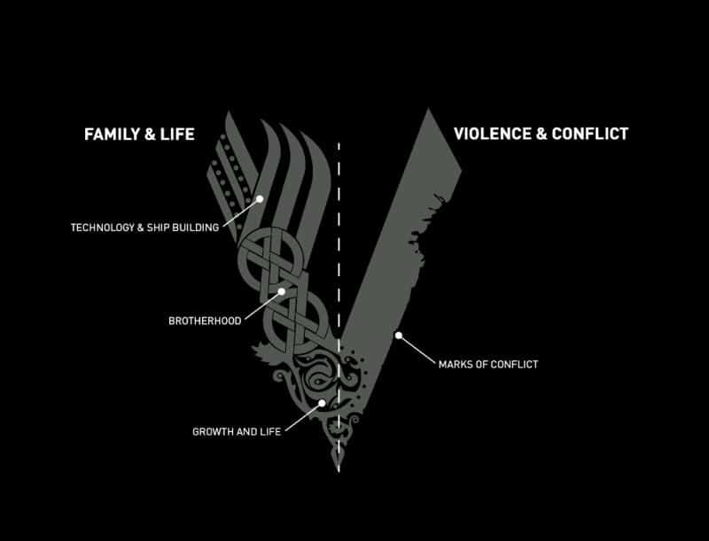 Als Reddit-User «pcm99» auf der Suche nach einem guten Foto vom «Vikings»-Logo war, stolperte er über ein Bild, das die verschiedenen Elemente des Logos erklärte. Offensichtlich wusste niemand, dass das Logo tatsächlich einen tieferen Sinn besitzt. Die linke Seite des Buchstaben steht für die Familie und das Leben der Wikinger. Der obere Teil – dicke, wenig geschwungene Striche – soll die Technologie und den Schiffbau der Wikinger repräsentieren. Darunter folgt ein miteinander verbundenes Symbol, in dessen Kern sich zwei Kreise befinden. Ein Symbol für die Brüderlichkeit, heisst es in der Erklärung. Der unterste Teil des Buchstaben «V» ist der Kern und die Ausgangslage, der sich selbst zu einem gewissen Teil auf die rechte Seite ausdehnt. Dieser Part ähnelt Ranken, die den Wachstum und das Leben verkörpern. Der gerade Balken auf der rechten Seite ähnelt der gefährlichen Scheide einer Waffe. Hier und da hat sie kleine Risse und Abnutzungen, die auf zahlreiche Konflikte hinweisen. Am oberen Endstück sehen wir sogar einen Blutfleck. Die rechte Seite des Buchstaben, so beschreibt es die Grafik, soll die Gewalt und die Konflikte im Leben der Wikinger vertreten. Und wer bisher alle Episoden von «Vikings» gesehen hat, weiss, dass es der Serie keinesfalls an Konflikten und blutigen Auseinandersetzungen mangelt.
