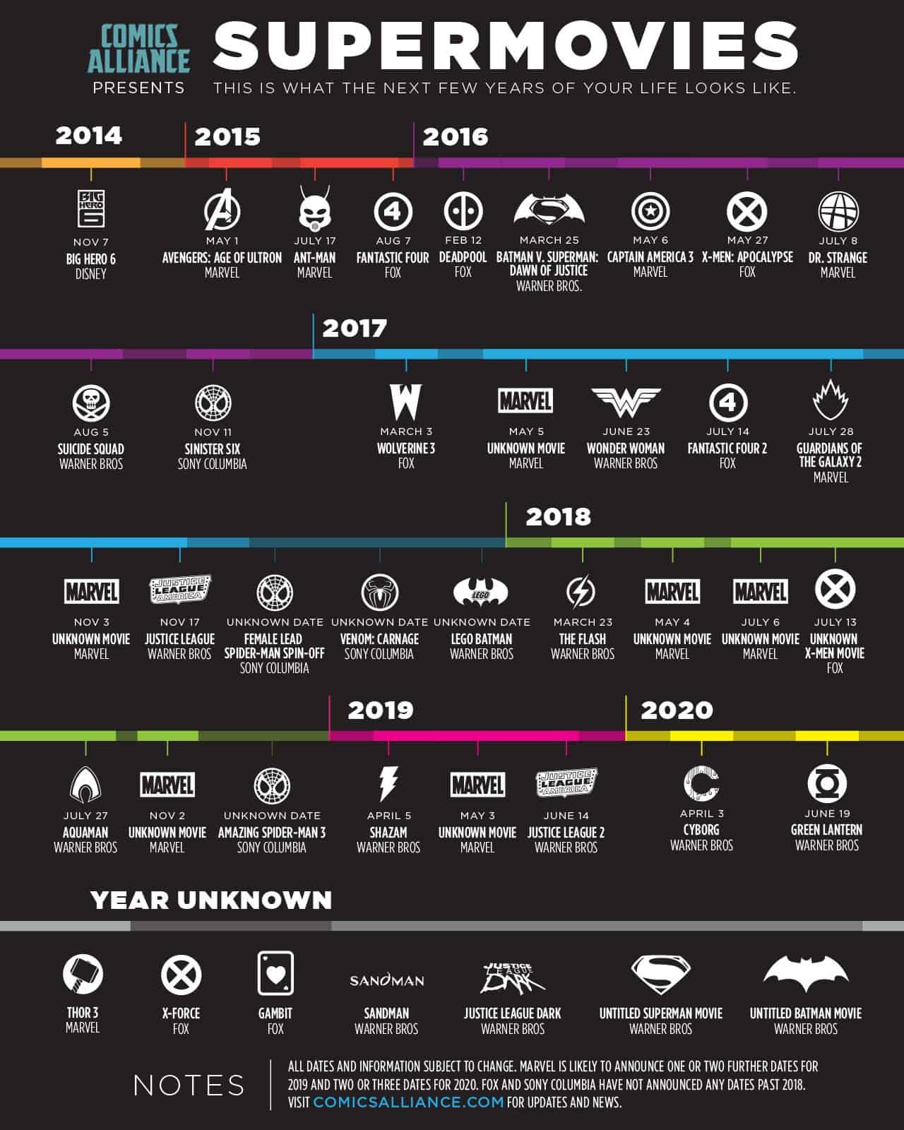 Die Comics Alliance hat eine schöne Infografik erstellt welche uns aufzeigt, was uns in den nächsten Jahren (bis 2020) an Superhelden Movies von Marvel oder DC zu erwarten ist…