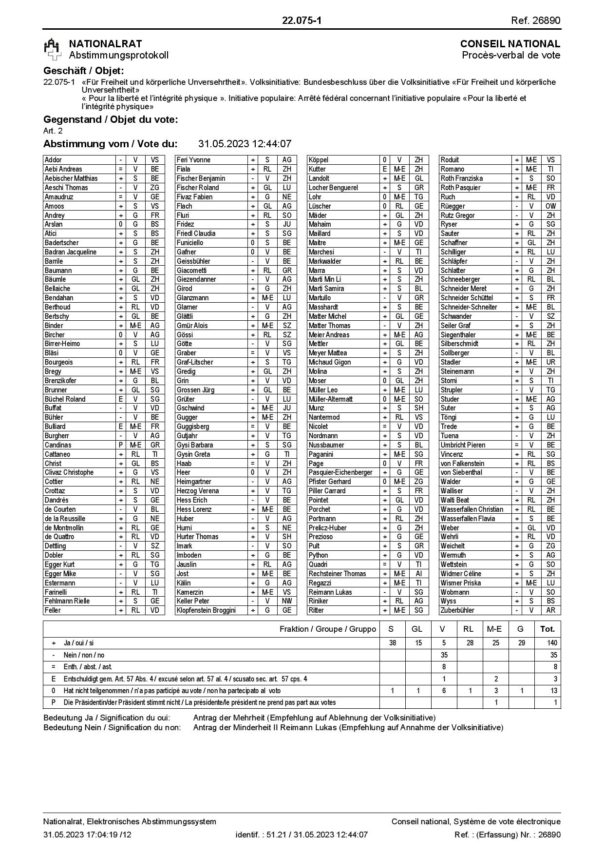 Vor einigen Monaten hatte ich bereits eine Wahlempfehlung für die kommenden National- und Ständeratswahlen 2023 aufgezeigt, hier die Abstimmungsresultate des National- und Ständerats vom 30.05.2023 betreffend der Initiative «Für Freiheit und körperliche Unversehrtheit» (+ JA = Verlängerung). Merkt euch die Namen der JA-Sager, im Herbst können wir sie getrost abwählen, denn sie sind keine Volksvertreter, sondern Lobbyisten, die in ihrem ureigenen Interesse handeln und ihre Einnahmenquellen schützen…