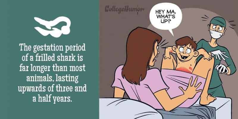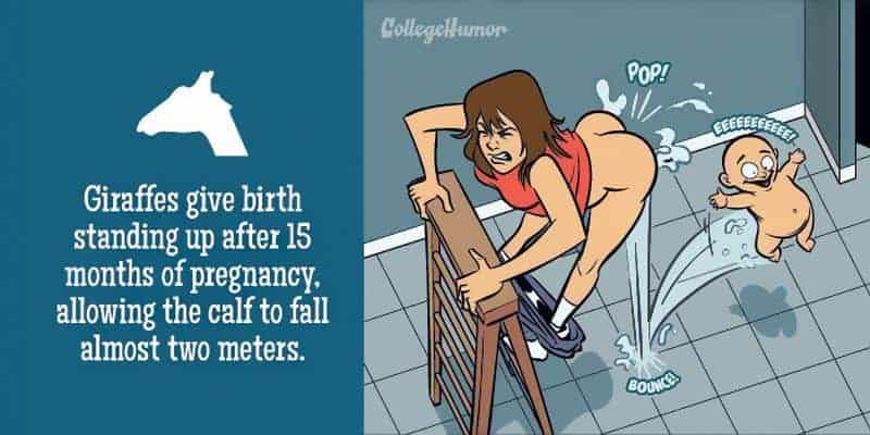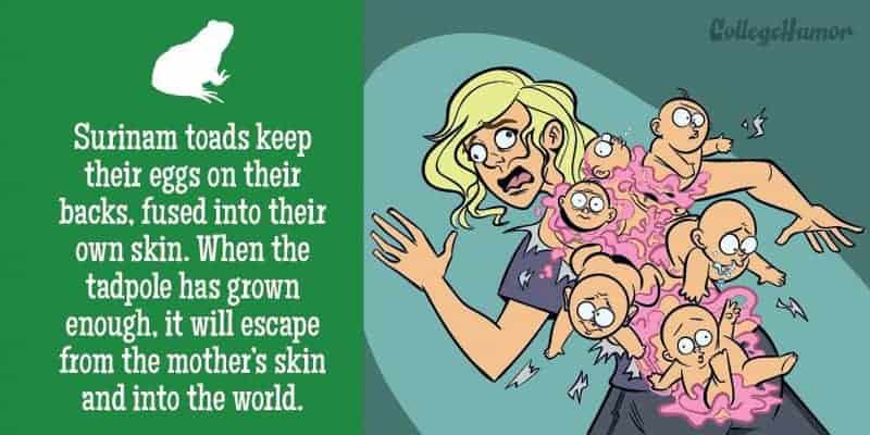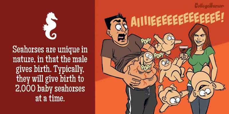 Freunde, habt ihr euch jemals gefragt, was passieren würde, wenn Menschen wie Giraffen gebären würden? Nein? Wie wäre es Seepferdchen? Illustrator Paul Westover hat sich diesen Fragen für College Humor angenommen und dazu folgende lustige Bilder gezeichnet. Während die Geburt für Frauen meist ziemlich schmerzhaft ist, ist es nichts im Vergleich zu dem, was gewisse Tiere durchlaufen müssen. Nehmen wir zum Beispiel mal die Wabenkröte, die auf dem Rücken ihre Eier, welche mit ihrer eigenen Haut fusionieren. ausbrütet und wenn die Kaulquappen bereit sind zu schlüpfen, sie einfach aus ihrer Mutter platzen . Wie aus einem Horrorfilm. Oder wie wäre es mit dem Kragenhai? Ein ungeborenes menschliches Baby wird für neun Monate von der Mutter getragen und schon dies mag vielleicht unbequem sein. Aber man stelle sich vor, die Kleinen für drei und ein halbes Jahr mit sich zu tragen…