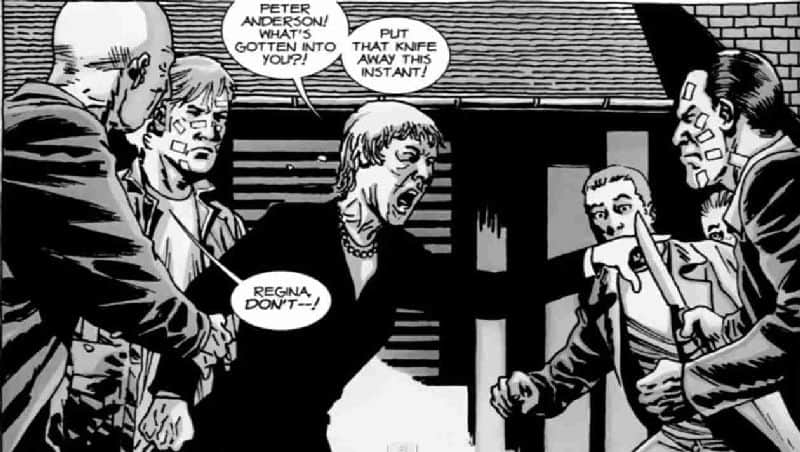 Zu jenem Zeitpunkt sind Rick und Douglas Monroe, die «Deanna» aus den Comics, gerade in eine Diskussion darüber verwickelt, wie sie Jäger Scott beerdigen sollen, der verletzt von einer Jagd zurückkam und starb (hoffen wir mal, dass dieses Comic-Schicksal nicht auf Tara übertragen werden wird!). Pete unterbricht also diese Diskussion – allerdings mit einem Messer in der Hand, mit dem er Rick bedroht. Douglas‘ Ehefrau Regina wirft sich sogleich zwischen die beiden, um sie auseinanderzubringen, wird jedoch durch Petes Messer-Attacke getötet. Pete versucht daraufhin, Rick die Schuld in die Schuhe zu schieben, doch Douglas ist derart entsetzt, dass er Rick befiehlt, Pete zu erschiessen – was dieser auch ohne Zögern erledigt. So stirbt also Pete in den Comics – und wir fragen uns, was die Produzenten wohl in der Serie daraus machen werden? Sollte es zu dieser Situation kommen, wird sich dann Reg zwischen die beiden werfen? Oder gar Spencer, der zweite Sohn der Monroes? Und wird Deanna (oder wer auch immer dann noch übrigbleibt) ebenfalls befehlen, Pete zu erschiessen oder soll er stattdessen, wie normalerweise von ihr bevorzugt, lediglich verbannt werden? Wir sind jedenfalls schon gespannt darauf, zu sehen, wie diese ganze Konfrontation vonstatten gehen wird!