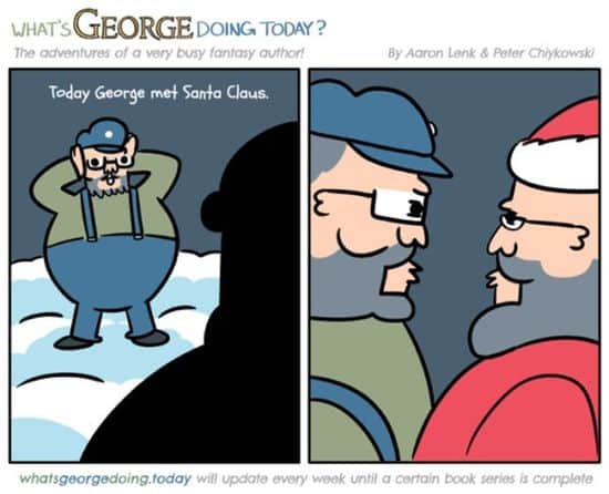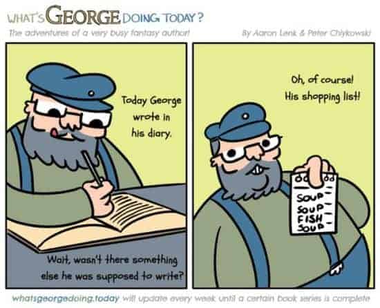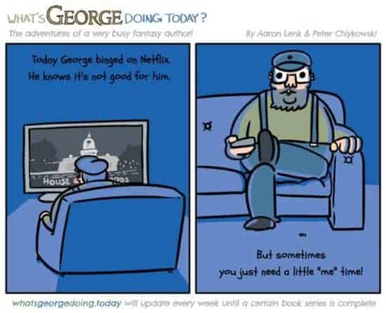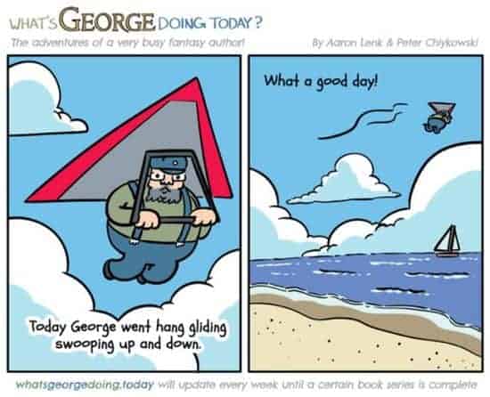 George R.R. Martin ist ein vielbeschäftigter Mann. In der Tat ist er so beschäftigt, dass er das sechste Buch in seiner «Song of Ice and Fire»-Reihe nicht beenden kann, obwohl das «Buch» bereits auf HBO ausgestrahlt wurde. Hier ist eine Reihe Comics von Rock Paper Cynic, die einen Blick auf einige der Sachen werfen, die George so macht, anstatt sein Buch zu schreiben. Wöchentlich wird auf «What’s George R.R. Martin Doing Today?» einen neuer Comic veröffentlicht, solange der Autor nicht mit «The Winds of Winter» fertig ist…