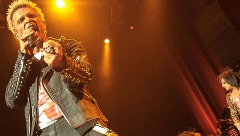 Bei traumhaftem Wetter gewährte die Freilichtbühne des Z7 praktisch jedem der knapp 2800 Besucher optimale Sicht auf das Geschehen und es fanden sich viele Menschen im besten, sprich meist mittleren Alter ein, die dem guten Billy sicher schon länger die Treue halten, sprich die Show war Ausverkauft. Dabei befanden sich kaum «szenige» Leute auf dem Gelände, die allermeisten waren einfach Menschen in «normalen» Klamotten. Vor Billy Idol wurden die Zuhörer erst einmal durch Gloria Volt, einer Band aus Winterthur, auf den Abend eingestimmt. Mit druckvollem Sound wurde ein Set von etwa 40 Minuten durchgerockt. Nach einer Umbaupause war es dann auch soweit, Billy Idol betrat die Bühne am Z7. Es war schon etwas merkwürdig: Da steht ein ein praktisch 60 jähriger Mann auf der Bühne und tut so, als wäre er immer noch der ewig jugendliche Rebell. In Lederkluft, wasserstoffblondem Strubbelkopf und mit dicker Trotz-Lippe schert er sich keinen Dreck darum, dass er inzwischen zu den Stubenältesten im Punk-Disneyland zählt. Mit den Worten «Can you hear me?» enterte William Albert Michael Broad, wie Billy Idol mit bürgerlichem Namen heisst, die Bühne. «Once again I’m running, in times that are frightening, but I won’t let that break me. I won’t let that take me down again», singt er im Opener «Postcards Form The Past». Er hat nach langen ausufernden Jahren mit Sex, Drugs and Rock’n’Roll seinen Platz gefunden in der Popgeschichte, versprach alle seine Hits zu spielen, heizte den jubelnden Fans gleich so richtig ein und die Stimmung stand sofort auf Sturm.