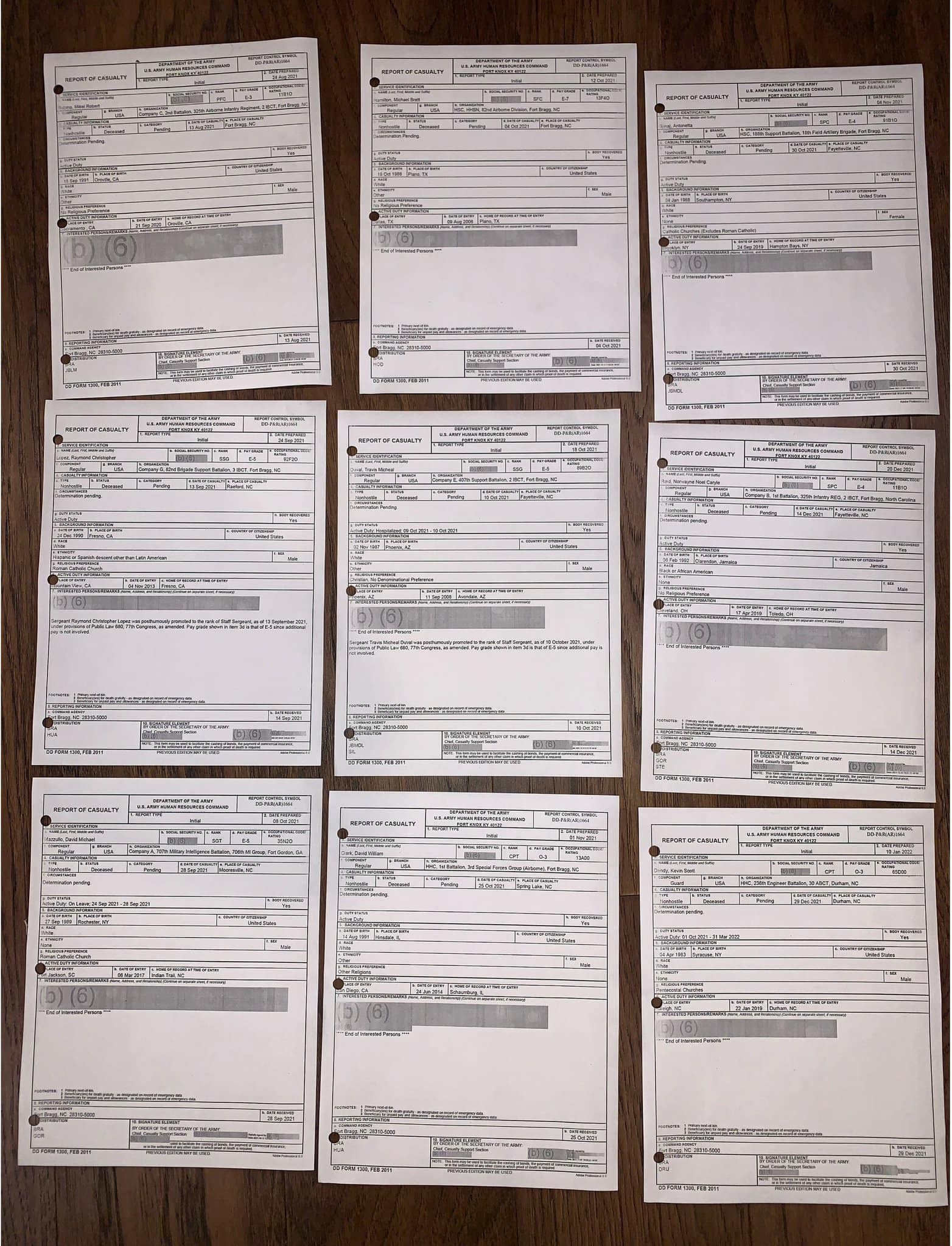 Bild 1 und 2 zeigen US-Soldaten, alle zwischen 20 und 40 Jahren, die in den letzten Monaten in Fort Bragg aus «unbestimmten» Gründen gestorben sind oder nachdem sie «nicht ansprechbar» in ihren Unterkünften entdeckt wurden. Zwei von ihnen kamen durch Motorradunfälle ums Leben. Bei den anderen ist unbestimmt, warum. Allein im Oktober 2021 starben dort alle drei Tage ein Soldat.